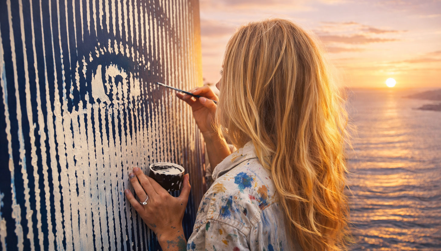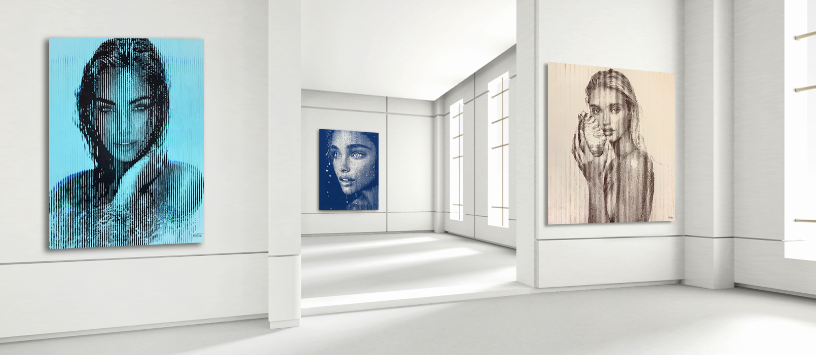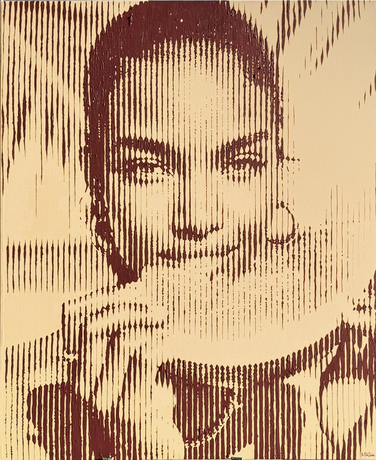 Montana Engels is a contemporary artist known for her own hand-painted stripe technique. Using only stripes she creates 1/1 unique portraits that shift between abstraction and realism due to perspective. Viewed up close, the paintings dissolve into structured lines. From a distance, they become a powerful and detailed painting.